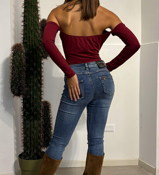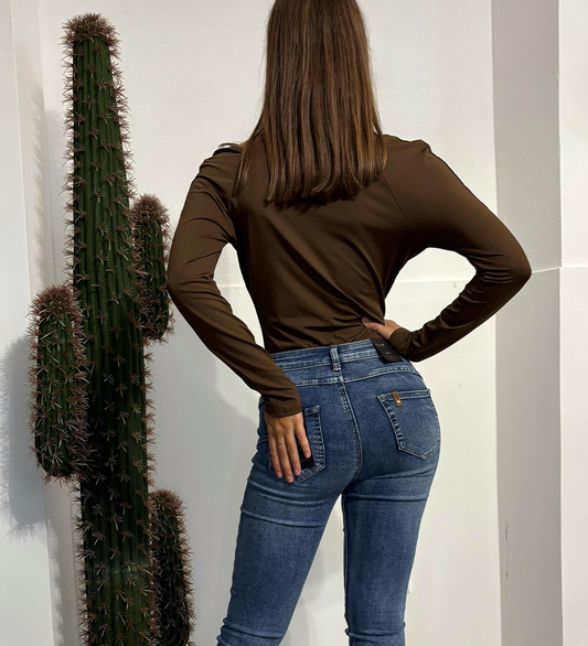 Body elegante in tessuto morbido ed elasticizzato, caratterizzato da girocollo con dettaglio metallico dorato che valorizza il décolleté.La manica lunga e la scollatura drappeggiata donano un effetto sofisticato, mentre la chiusura sul retro mantiene una vestibilità confortevole e avvolgente. Perfetto per outfit da sera, aperitivi ed eventi, ideale con jeans...