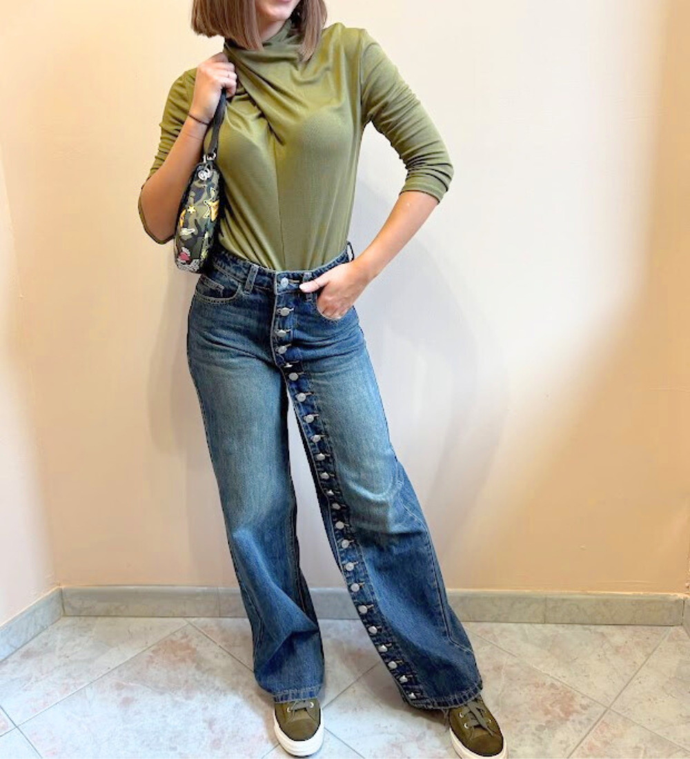 Jeans con Bottoni Laterali Jeans contemporaneo che interpreta le ultime tendenze della moda giovane con una linea di bottoni decorativi che percorre l'intera gamba. Questo dettaglio distintivo aggiunge movimento e personalità al capo, trasformando un classico in una dichiarazione di stile. Realizzato in denim di qualità, offre comfort e libertà di movimento senza compromessi. La chiusura frontale a bottoni garantisce praticità e solidità, mentre il design laterale crea un effetto visivo che allunga la silhouette. Perfetto per chi desidera distinguersi mantenendo l'autenticità del denim, questo jeans combina funzionalità e tendenza in un'unica proposta versatile e moderna.